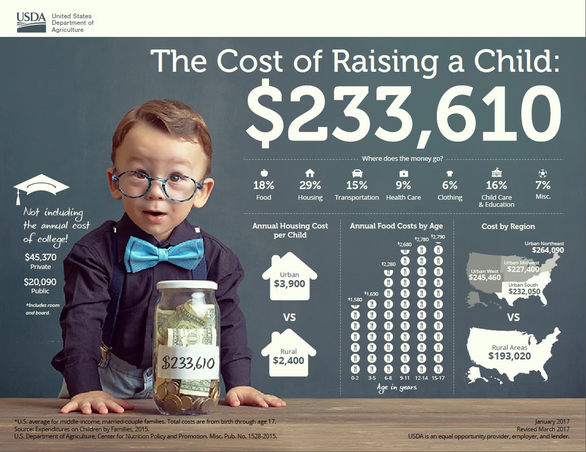 If your child was born in 2015, you can expect to spend an astonishing $233,610 on their upbringing over the first 17 years, according to the United States Department of Agriculture. This figure is based on expenses incurred annually by middle-class, married-couple families and ranges from $174,690 for lower-income families to $372,210 for higher-income families. Notably, these estimates exclude costs related to pregnancy and college, which can add tens of thousands more.